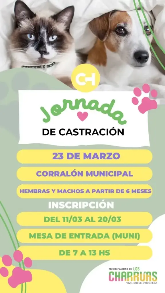 La municipalidad de Los Charrúas informa que el 23 DE MARZO DEL 2024 se llevará a cabo la primer jornada de castración para mascotas, hembras y machos; a partir de los 6 meses de edad en el corralón municipal.