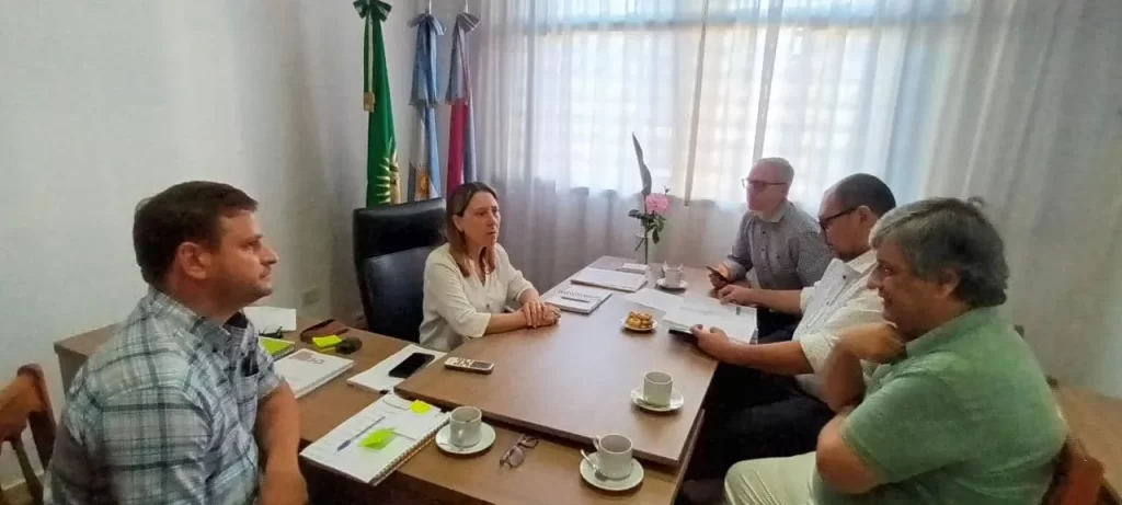 Reunión con el Vocal Pablo Canali de CAFESG. Junto con la Presidente Municipal, Andrea Imoberdorff ,el Secretario de Hacienda Luis Leon Haffner y el Secretario de Gobierno Marcelo Pasca rielo se abordó una agenda de trabajo común, en la cual el ente colaborará con un estudio topográfico necesario para optimizar y proyectar obras de drenaje pluvial. Además, se gestionará una nueva etapa de obras de ampliación en la red cloacal.