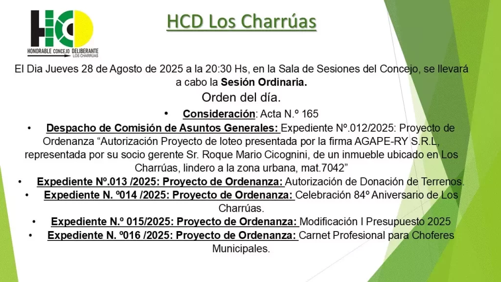 • Despacho de Comisión de Asuntos Generales: Expediente Nº.012/2025: Proyecto de Ordenanza “Autorización Proyecto de loteo presentada por la firma AGAPE-RY S.R.L, representada por su socio gerente Sr. Roque Mario Cicognini, de un inmueble ubicado en Los Charrúas, lindero a la zona urbana, mat.7042”: APROBADO POR UNANIMIDAD.